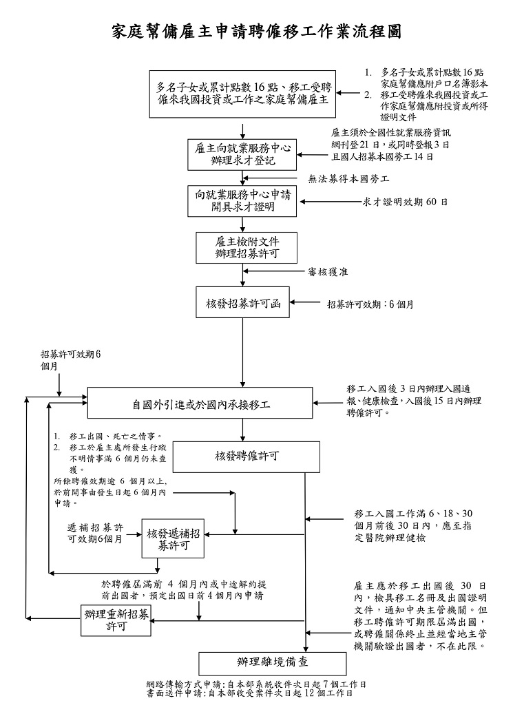 外國人從事就業服務法第四十六條第一項第八款至第十一款工作資格及審查標準| 外籍家庭幫傭申請流程圖| 申請外籍家庭幫傭之資格及應備文件| 申請聘僱家庭外籍看護工評估醫院名單| 外籍看護工申請流程圖| 申請外籍看護工之資格與應備文件